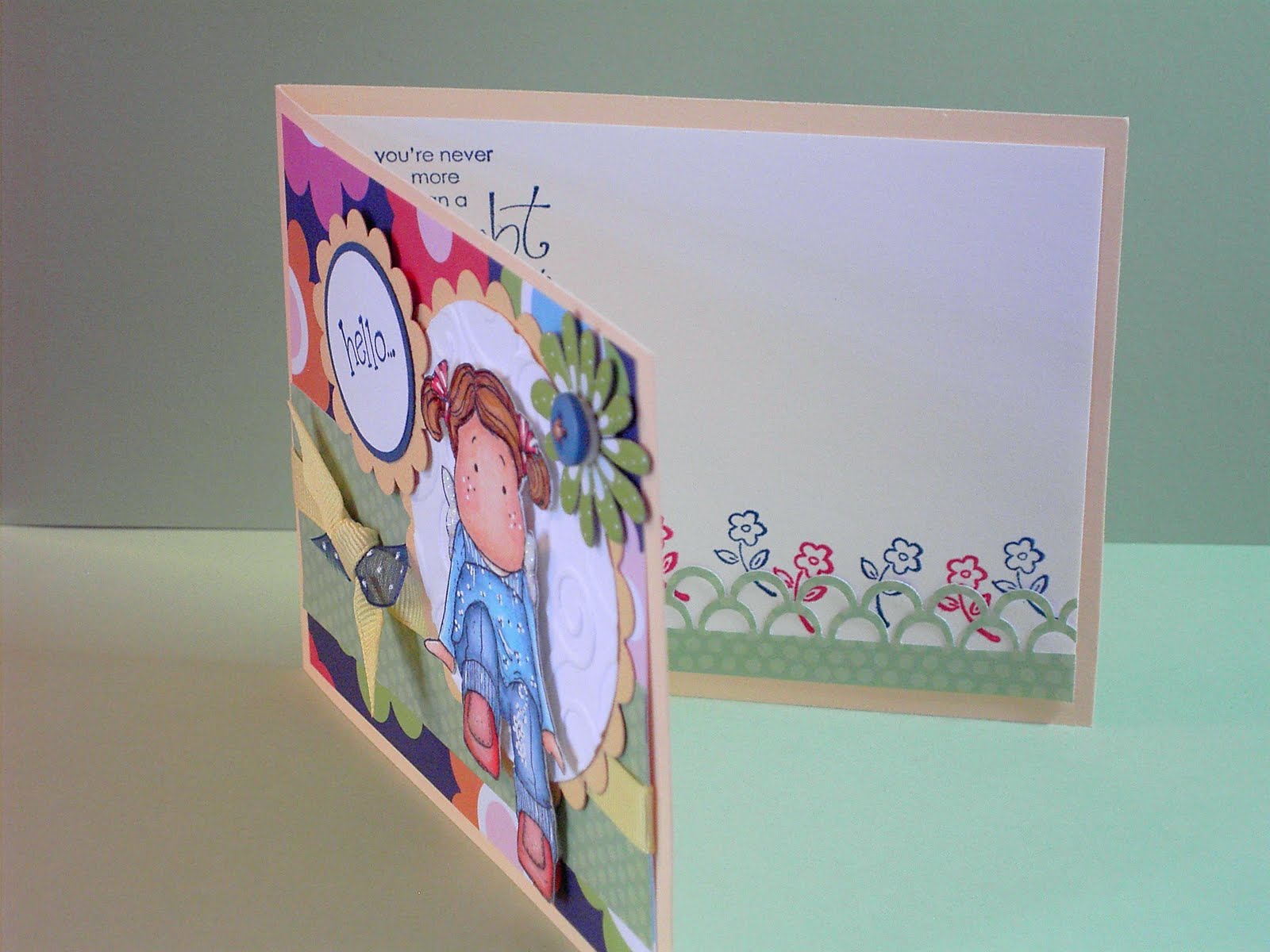 Hi again!! I've been practicing my coloring and just whipped this little card together. Not too "embellished" but cute, just the same (if I do say so myself!) I used Stampin Up cardstock (barely banana) and a variety of designer papers from my scrap stash. I colored Tilda w/these Copics: