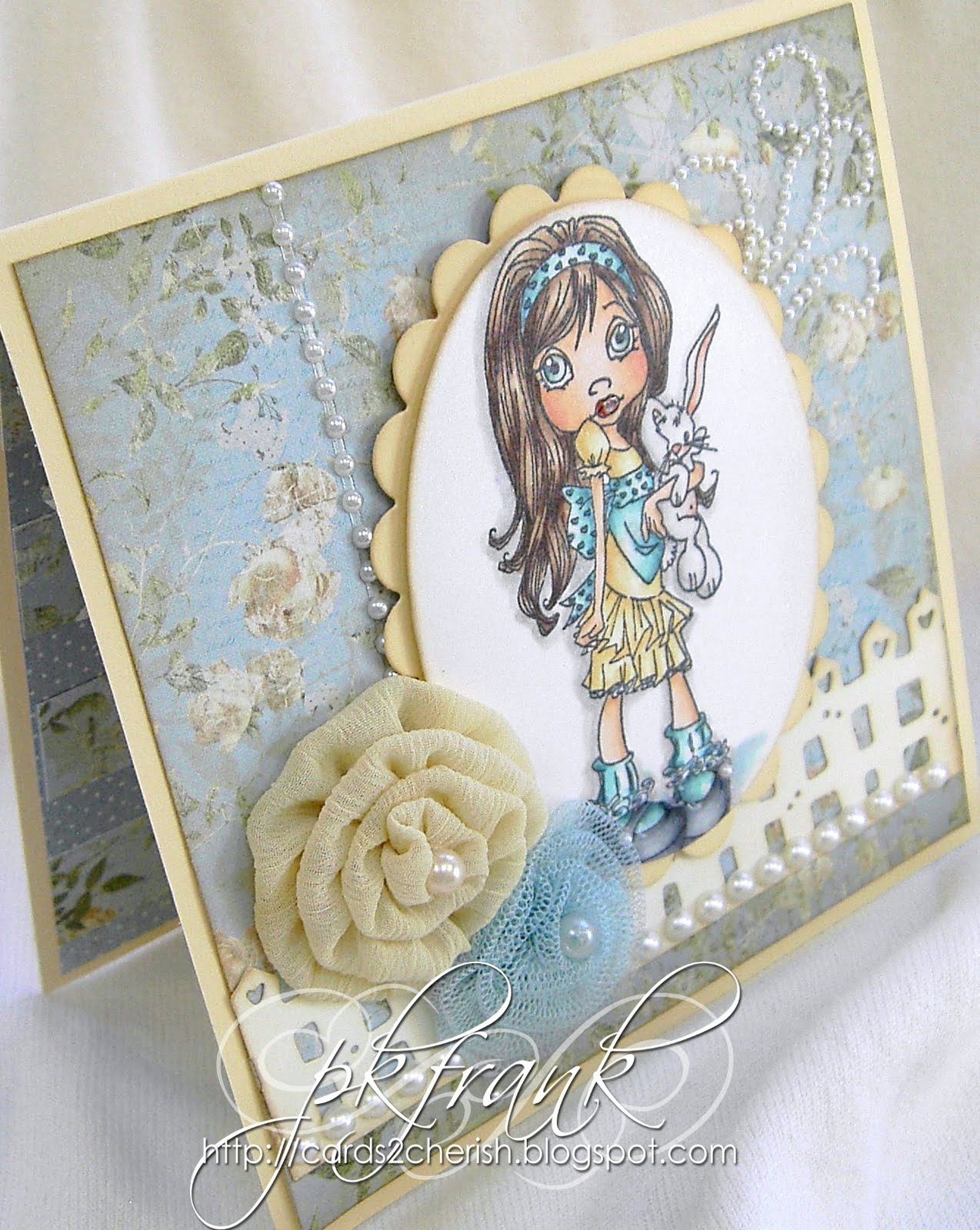 I used Copics to color this sweetie... E21, 00, 000, 0000 (skin); R20 (cheeks); R21 (lips); BG72, 10, 000, 0000, B21, 0000 (blues); RV34, 32, 10, 000 (pinks); E53, 51, 50, 15, Y21 (hair); G21, 20, YG63 (grass); Y18, 15, 13, 11, E53, 50 (bunny); W2 (shading); B0000 (light blue glow around this adorable little doll babyl!!)...and the fun sentiment inside is from Stampabilities!
